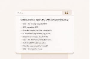 Vienas dažniausių mitų, kad GEO niekuo nesiskiria nuo tradicinio SEO. Iš tiesų klasikinis SEO orientuojasi į pozicijas paieškos rezultatuose, o GEO – į tai, ar jūsų turinys bus cituojamas ar naudojamas generatyvinių atsakymų formavimui.