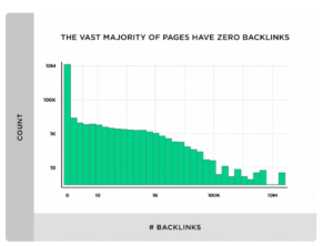 Infografikas atskleidžia, kad didžioji dauguma interneto puslapių neturi nė vienos atgalinės nuorodos. Stulpelis ties „0 backlinks“ yra ženkliai aukštesnis nei visi kiti. Didėjant nuorodų skaičiui, puslapių kiekis smarkiai mažėja, o tai pabrėžia, jog stiprus nuorodų profilis yra reta ir konkurencinį pranašumą suteikianti savybė.