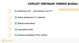 Būti Copilot atsakymuose reiškia būti dirbtinio intelekto rekomenduojamu šaltiniu, kuris pasiekia vartotoją dar prieš šiam spustelint bet kokią nuorodą. Tai ypatingai svarbu B2B įmonėms, paslaugų tiekėjams, edukaciniam ir aiškinamajam turiniui.